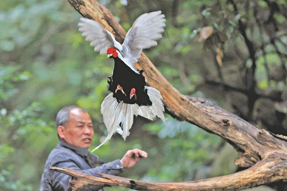 明溪县夏阳乡旦上观鸟合作社的社员汤清德,每天上山巡护,白鹇见到他,与之亲密互动。肖书平 摄