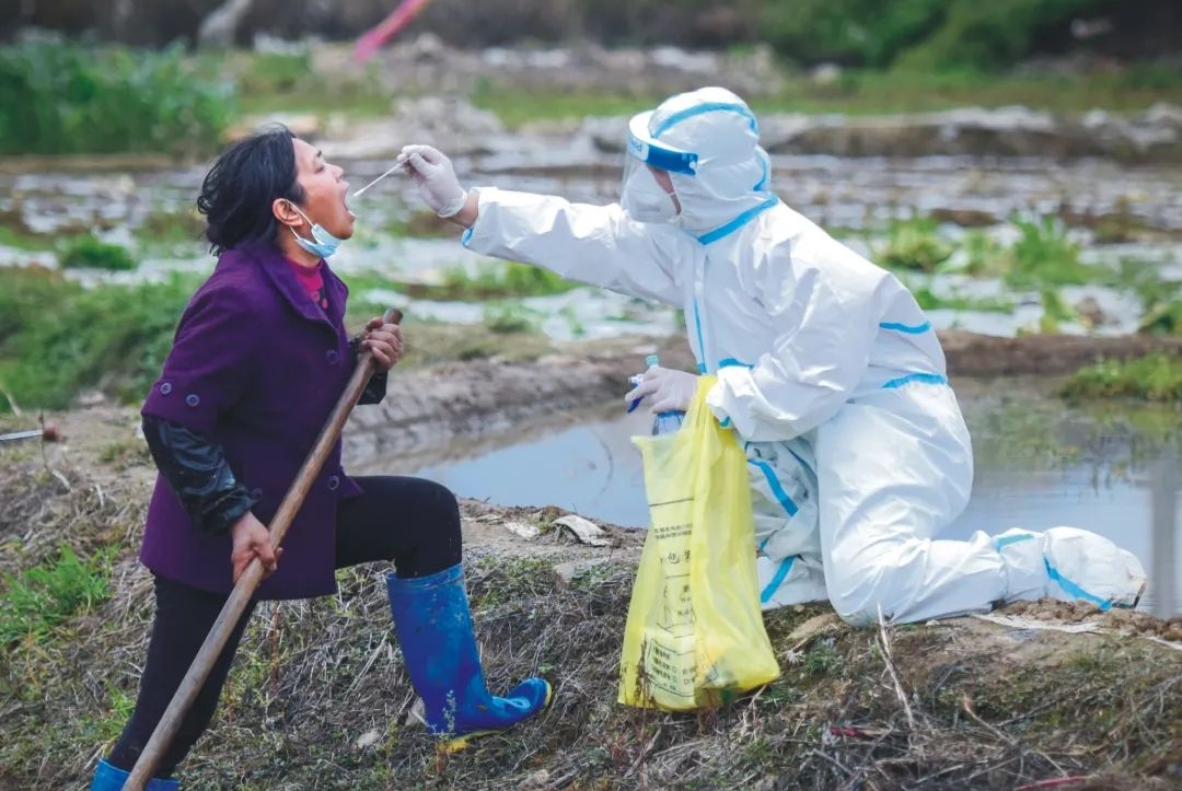 3月29号拍摄于大济镇,村民骑在三轮车上进行的核酸检测。乡村的采集点配套相对较差,医护人员克服硬件软件上的各种困难,迅速进入工作状态。如实履行进村入户、不漏一人。