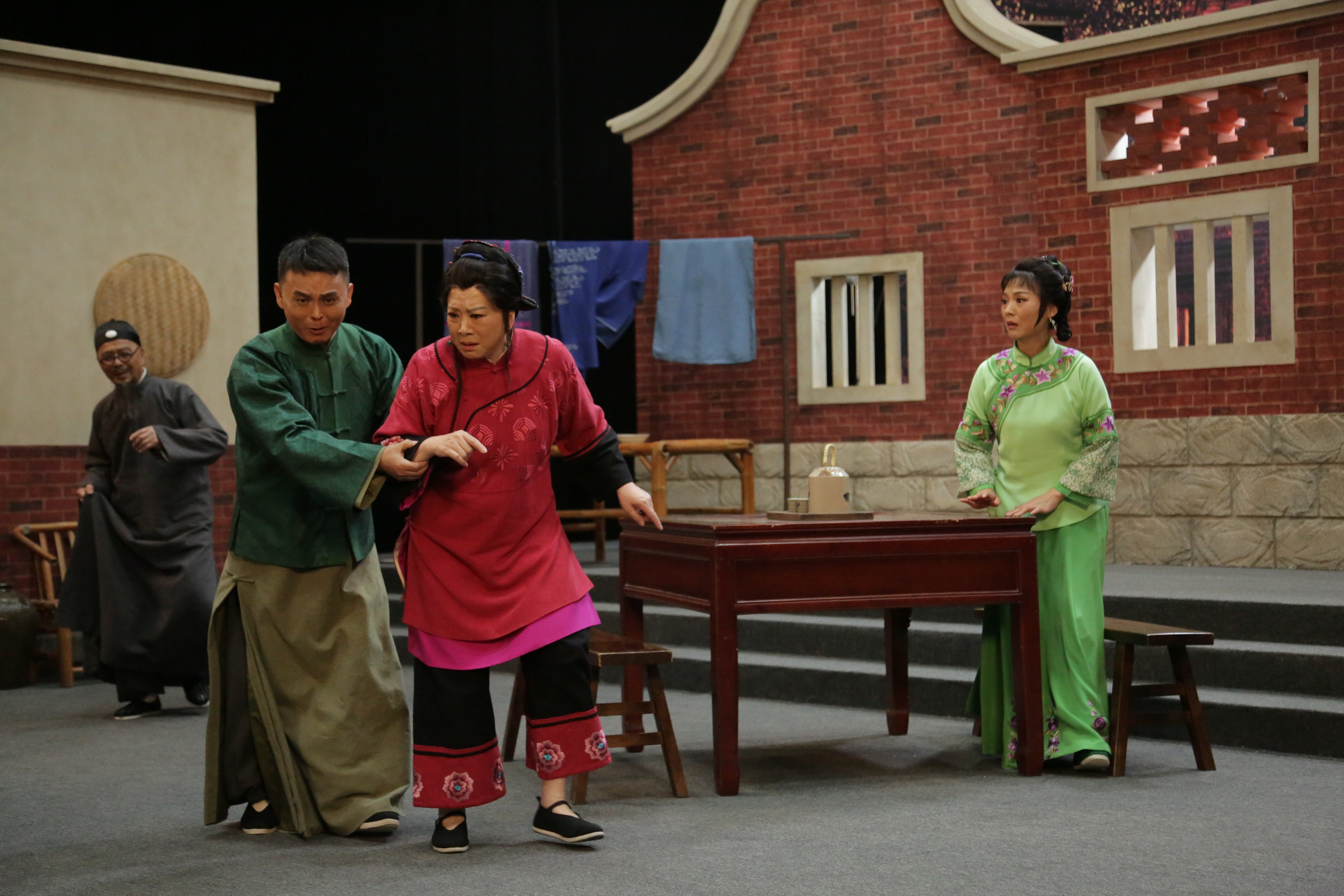 4日,厦门影视拍摄基地。在厦门首部高甲戏电影《阿搭嫂》拍摄休息间隙,厦门金莲陞高甲剧团舞台导演陈炳聪、吴伯祥不停地跟参加当天拍摄的两位演员探讨台位、走位事宜,陈炳聪当场示范了起来。