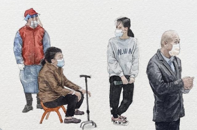 半个多月来,刘子祥感受到了疫情下全民配合的众志成城。“做核酸是近几年才有的特殊场景,希望通过作品来呈现一种时代感。”刘子祥表示,愿疫情尽快动态清零,大家都能恢复到正常的生活状态,未来,他还将继续更新抗疫题材的水彩作品。