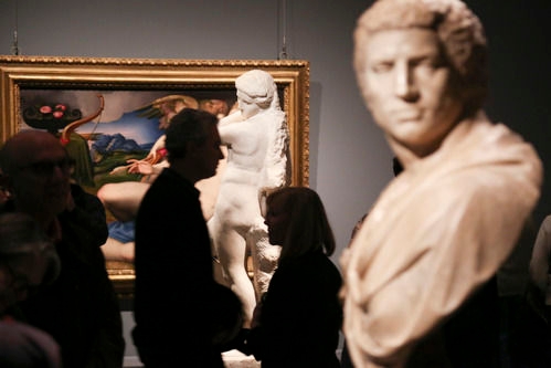 图为2017年11月13日,在美国纽约大都会博物馆举行的米开朗基罗艺术展上,一名参观者观看米开朗基罗的作品《罗马士兵》。新华社记者王迎摄