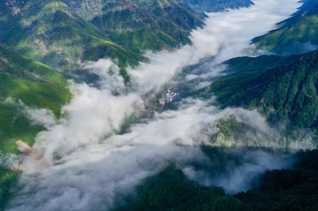 ▲武夷山国家公园武夷断裂带峡谷内云雾缭绕,村庄若隐若现(无人机照片)。(新华社记者 姜克红 摄)