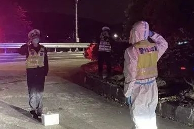 19时许,宁德高速交警支队一大队民警穿上了防护服,在飞鸾岭隧道洞口U转带通过无接触式领取的方式与福州高速交警支队民警完成了药物的交接。