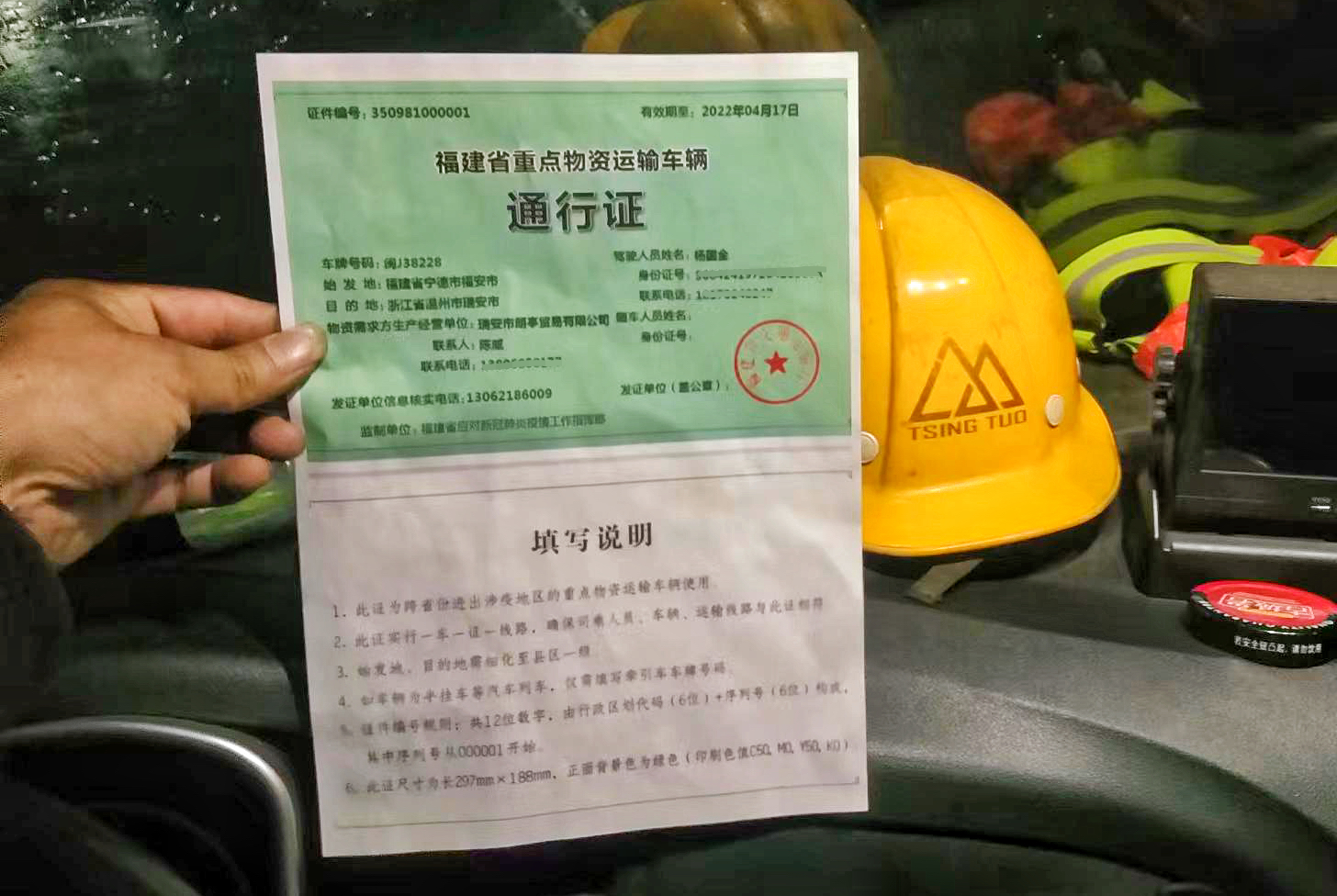 福建日报·新福建客户端4月16日讯(记者 张颖 范陈春 朱子微 通讯员 薛荣泰)16日下午4时,我国首张统一格式、全国互认的重点物资运输车辆通行证在宁德福安发放。福建青拓集团冷轧物流组的黄军校申领到尾数编号为0001的通行证。该通行证有效期至4月17日,始发地为宁德福安,目的地为温州瑞安,首批下发4张证书保障4辆车132吨不锈钢钢卷的运输。