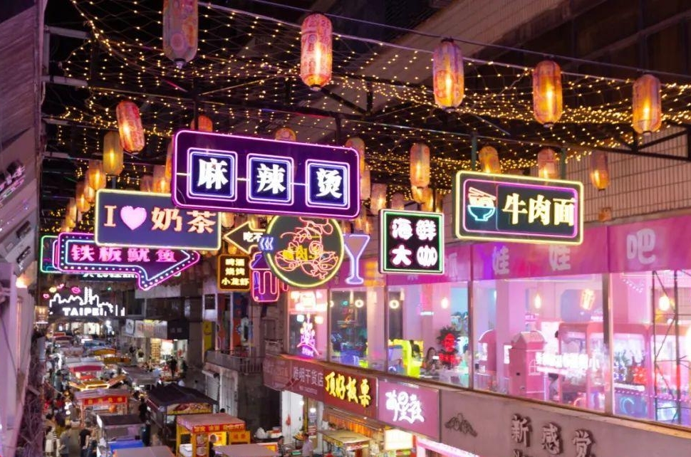 行走在夜市里,随处可见充满巧思的设计:两座天桥取台湾高铁站的始发和终点之意,贯穿台湾风情街。其间,台北的101 大楼、台北故宫博物院,台中的彩虹眷村、台南的美食、高雄的巨型摩天轮,以灯条剪影、店招、墙体彩绘的形式呈现,成为夜市一景。