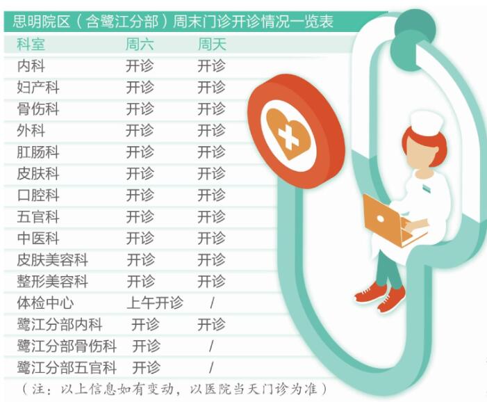据了解,思明院区在原有内科、妇产科、骨科、肛肠科、外科、皮肤科周末全天和体检中心周六上午开诊情况下,新增五官科、口腔科、中医科、整形美容科、皮肤美容科周末全天门诊。同时,为保证周末患者的就诊连续性和完整性,放射、检验、B超等辅助检查科室同步运行,手术室也开展择期手术。