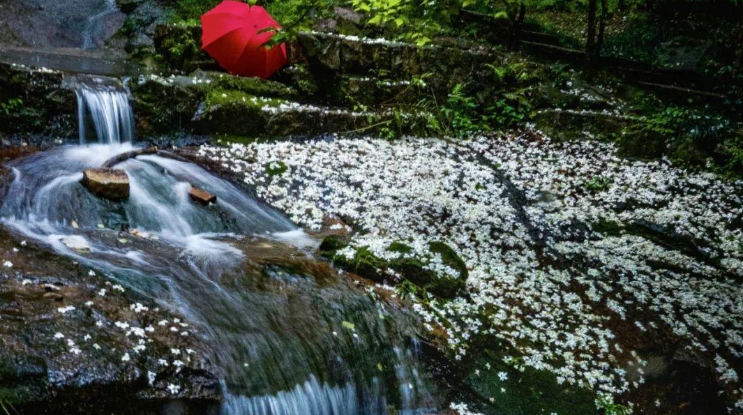 ▲洁白的花朵如雨般飘落,铺满了山坡、林间、道路、小径,形成一条洁白的花道。罗南军/摄
