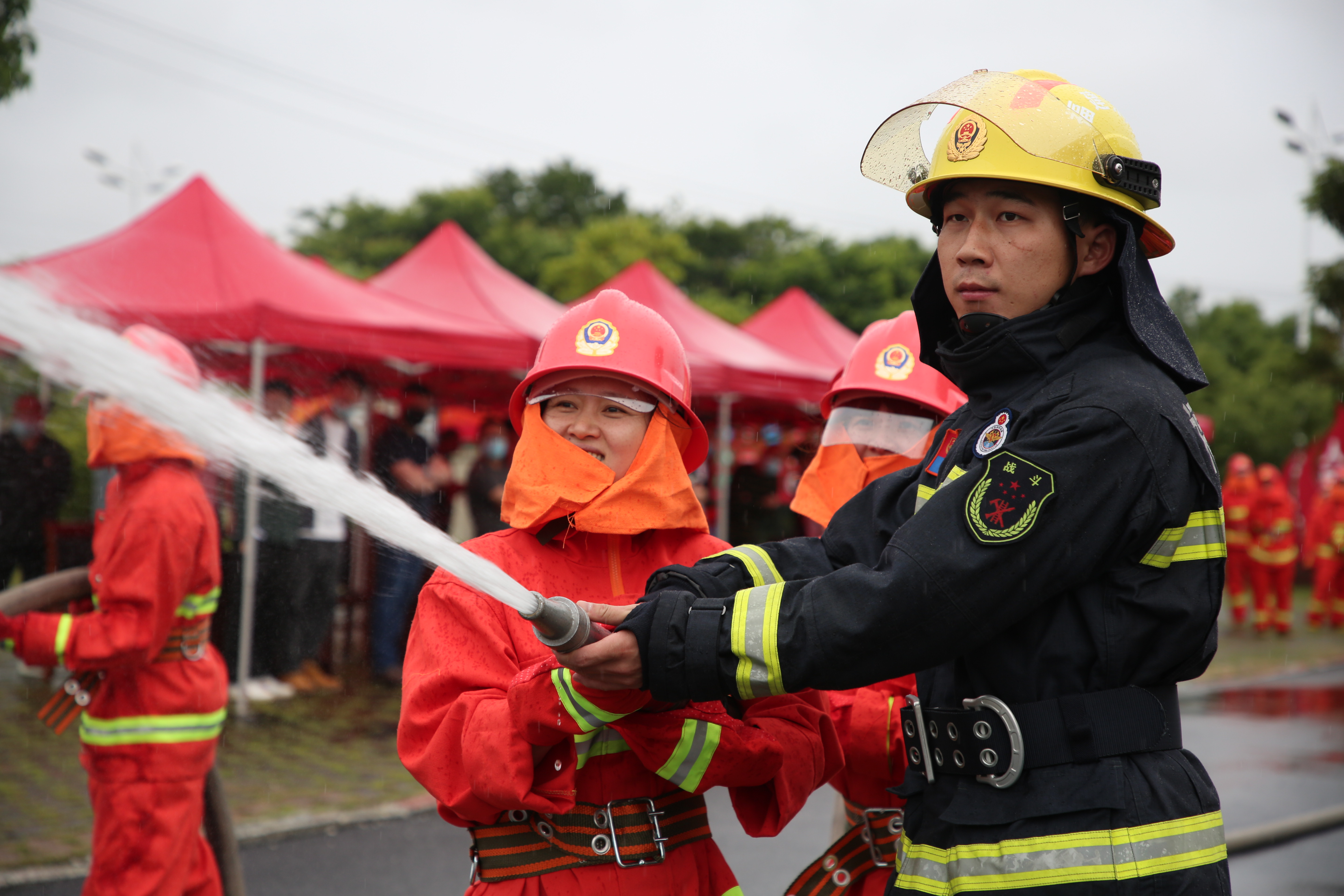 在微型消防站技能比武环节,来自企业的9支微型消防站共54名队员同台竞技,本次比武共设置“单干线双出水”射水打靶、扑救油盆火、快速佩戴防烟面罩3个竞赛项目。竞赛中,各组参赛队员动作准确迅速、干净利落、有条不紊,在各个紧贴微型消防站实际的竞赛项目中展现学习成果,体现“救早灭小”的实战能力。