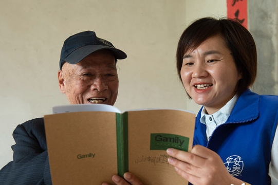 陈金端老人拿出笔记本,与方丽芳一起回顾网格员和 社区干部为他所做的点点滴滴。 记者 张旭阳 摄