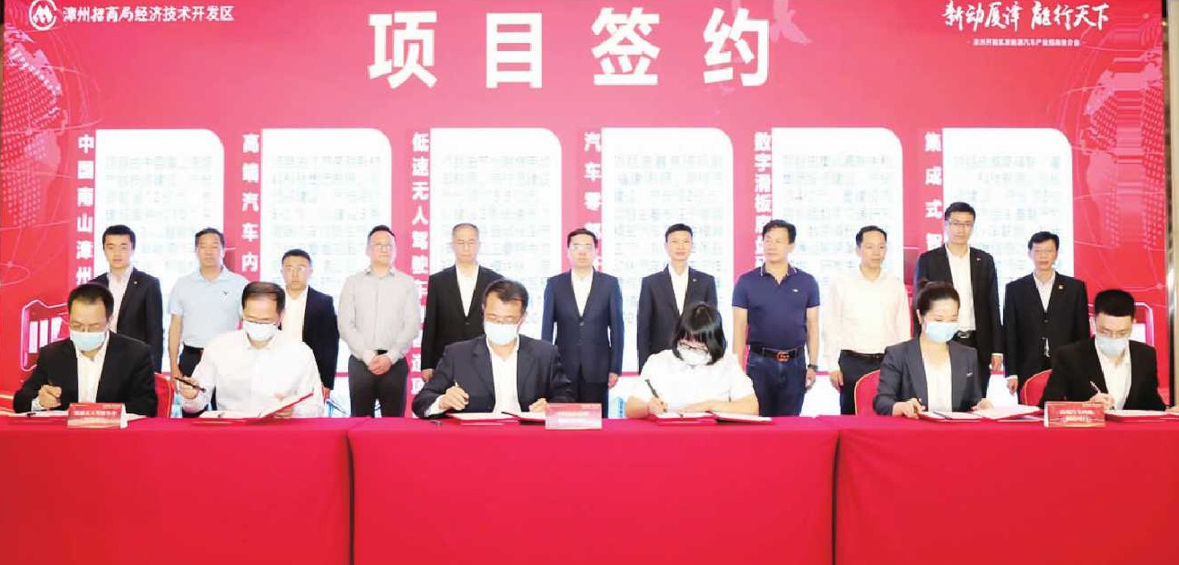 随后,现场领导嘉宾共同见证了中国南山漳州制造谷、高端汽车内饰制造、低速无人驾驶车身制造、汽车零部件新材料、数字滑板底盘研发和生产基地、集成式智联储运等6个项目签约,总投资约32.5亿元。推介会上,受邀嘉宾聚焦新能源汽车产业发展优势、市场机遇及未来发展方向等内容开展了圆桌会议。漳州开发区投资促进局相关负责人围绕漳州开发区基本情况、新能源汽车产业园区建设、产业配套与服务等方面作了全面推介。