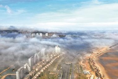 5月29日下午4时许,泉州台商投资区海湾大道獭窟岛附近路段迎来一场平流雾,低空流动的雾气为附近海岸线营造出仙境感,如梦如幻。(陈起拓 摄)