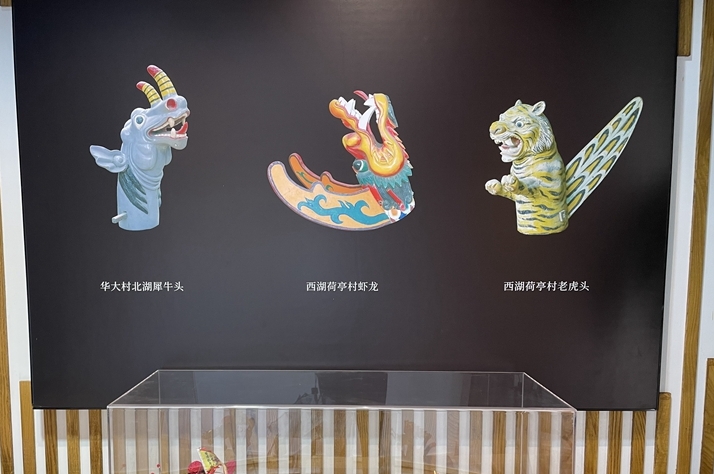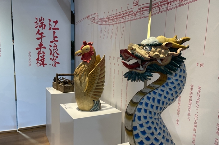 另一展区悬吊着柳叶桨,每片桨叶上画着不同的故事,国画写意,寓意美好。展览还将制作龙舟的技艺印在背景布上,令人眼前一亮。