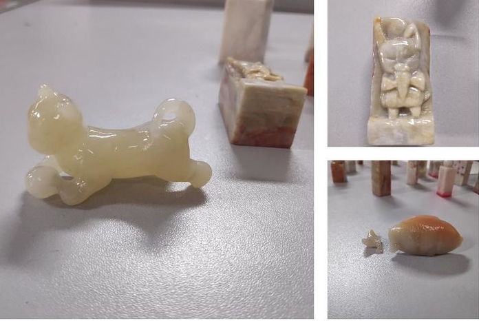 在程老师悉心指导下,我们已熟悉了雕刻的过程预案,知道了刻章、阴阳刻、薄意、篆刻。寿山石的历史,美到心上,陶养心性。老师教我们学习刀法,绘制草图,泥塑型,到大体雕型、细磨抛光。挨个指导,直到同学们手上拿稳了刀,一块块石头成了带稚气的手中精雕细磨的作品。
