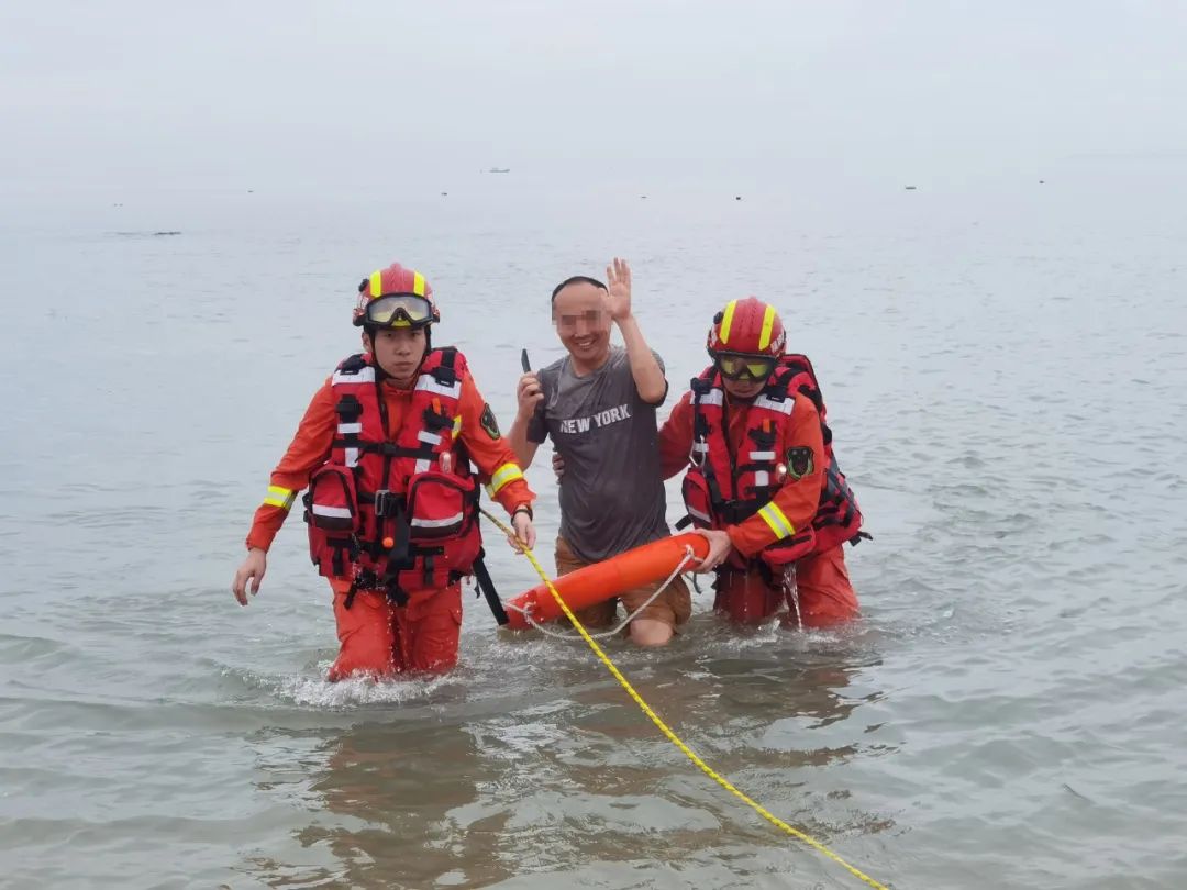 两名消防救援人员游至该男子身旁,发现他情绪淡定地玩着手机。他配合地套上救生圈,在消防救援人员的保护下,离开了海中礁石。经过两分钟的救援,该男子安全回到岸边。“谢谢你们!”脱困后,他笑着向消防救援人员连连道谢。