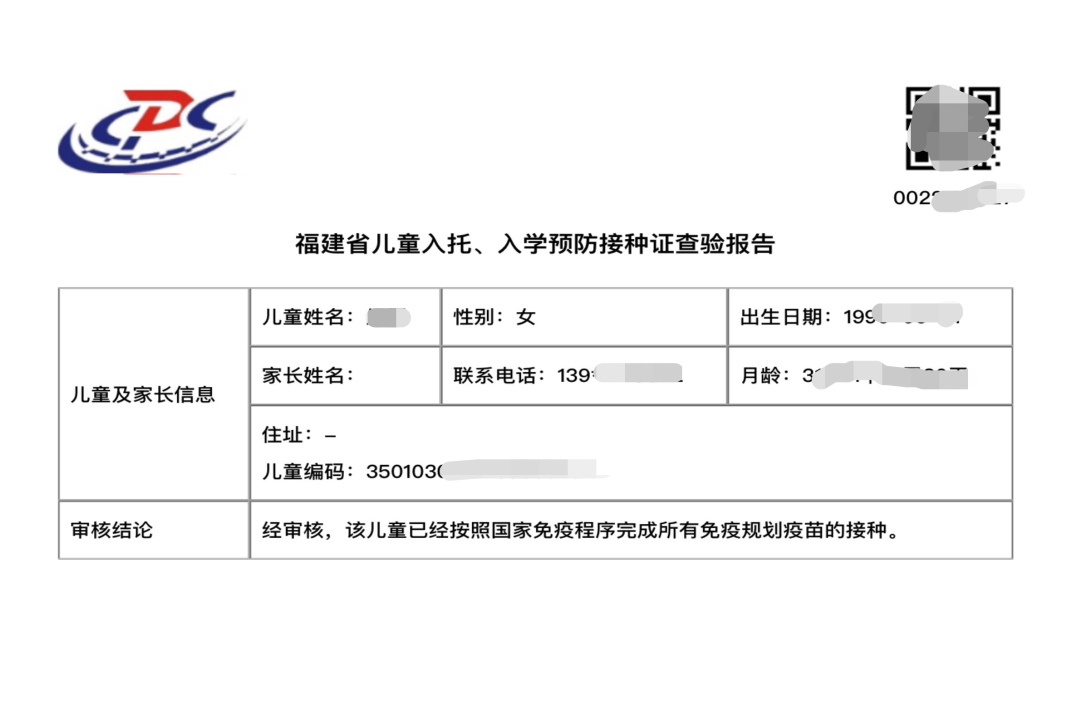 如果你家宝贝预防针都打齐了,点击“查看证明”,系统会生成《福建省儿童入托、入学预防接种证查验报告》(简称“查验证明”)。