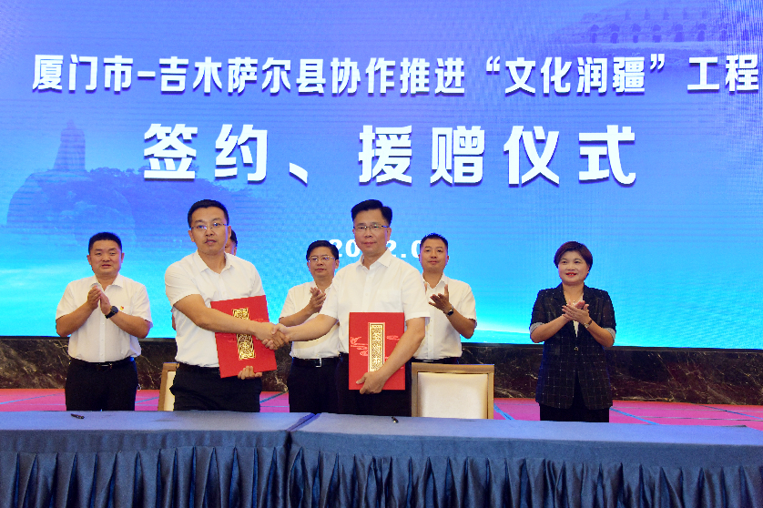 7月1日,厦门市与吉木萨尔县协作推进“文化润疆”工程签约、援赠仪式在吉木萨尔县举行。中共厦门市委常委、宣传部部长吴子东,厦门市委宣传部常务副部长、电影局局长、一级巡视员上官军,吉木萨尔县县委书记潘素华等出席活动。