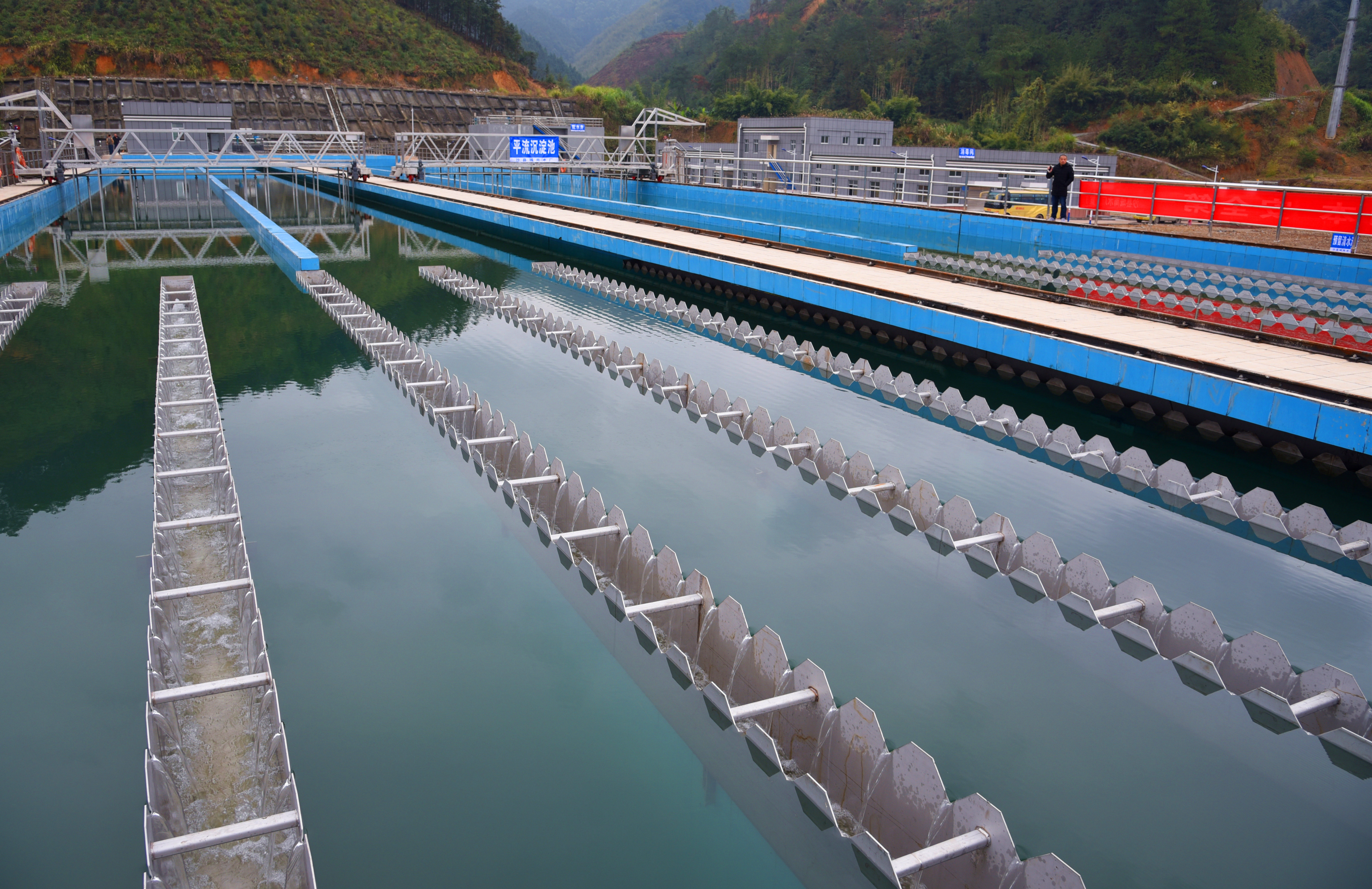 “我们水厂的沉淀池有110米长,大约是小水厂长度的四倍,这可以保证它沉淀的时间更久,处理水的效果更好。”沙县城南水厂厂长刘小聚介绍,除了沉淀池外,水厂还配备了V型滤池和自动反冲洗设备,进一步提升水质标准,“整个水厂设计规模15万吨,目前可实现7.5万吨制水量,是全三明市设计规模最大的水厂。”