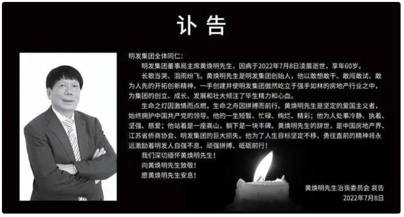 海峡导报·新福建客户端7月9日讯(记者 吴强)7月8日,明发集团在其官网发布讣告称,明发集团董事局主席、创始人黄焕明因病于当日凌晨逝世,享年60岁。