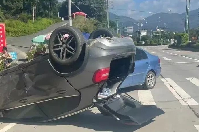 事故发生时,两车产生强烈撞击,致其中一部车辆“四脚朝天”,好在两车驾驶人均按照规定使用安全带仅受轻微伤。