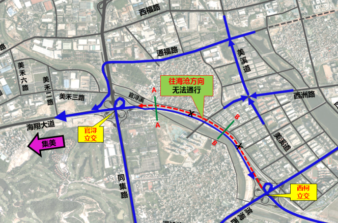 2022年7月23日0时至11月10日24时,海翔大道官浔立交(同集路口)至西柯立交(滨海西大道路口)段机动车实行由西往东单向行驶(由海沧往翔安方向),禁止机动车由东往西(由翔安往海沧方向)通行,上述立交范围内相关匝道同步封闭。