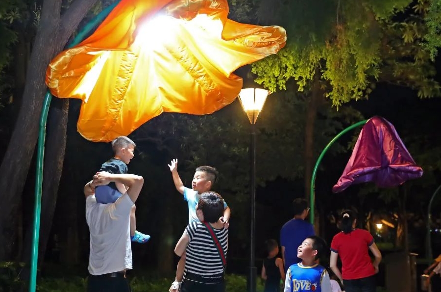 据介绍,该组“开花路灯”学名叫气模花,灯下装有红外线感应器,当有人经过时,感应器接收信号,就会启动电机,带动充气装置输气给上方的气模,从而让“花瓣”膨胀起来,花灯随之绽放点亮。当人们离开感应器范围,花灯就随之熄灭,“花瓣”闭合。