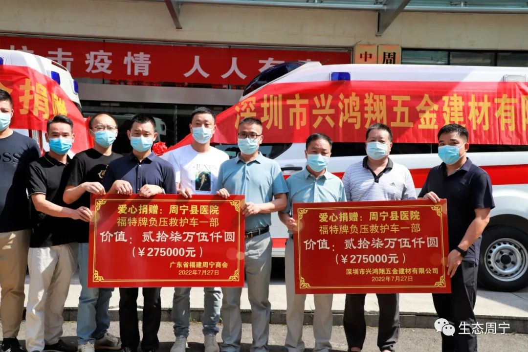 7月27日,广东周宁商会22家企业共同向周宁县总医院捐赠负压救护车两辆,总价值为55万元,助力周宁县医疗事业发展。
