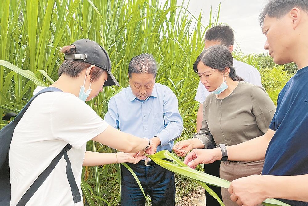 今年七月,林占熺(左二)在龙岩连城菌草基地察看巨菌草生长情况。林良辉 摄