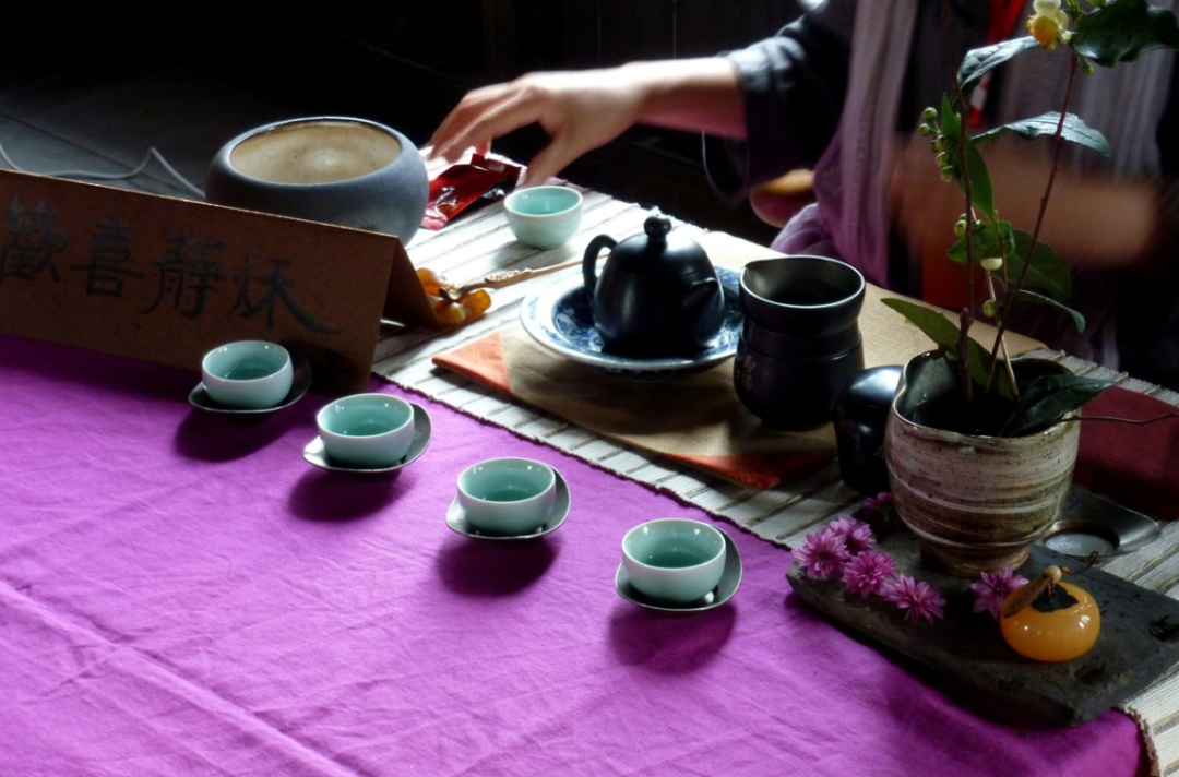 席具:日本铁壶,粉彩盖碗,心饮定制杯,唐盛竹叶青釉匀杯,游山陶坊黑陶碗,韩国陶制小茶罐,斑竹茶荷,竹枝,映月陶制则置,靛青色印花麻布,绿色棉麻布及苎麻,锡制小罐。