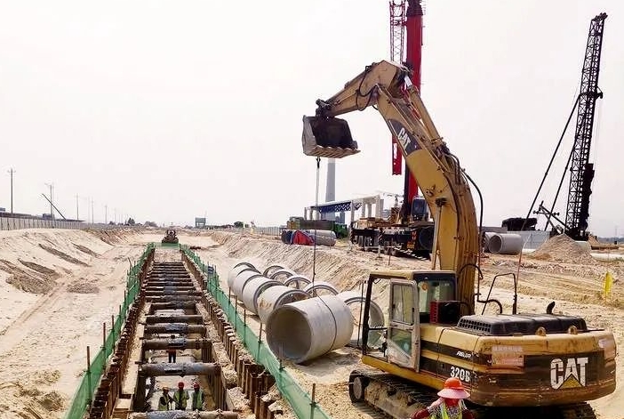在古雷石化园区次三路(精细化工园区连接线之一)项目现场,挖掘机轰轰作响,大型车辆来回穿梭回填土方。工人不惧高温天气加紧施工作业,开挖管道沟,铺设污水管、雨水管,汗水顺着脸颊一滴滴落下,衣服湿透了一次又一次。