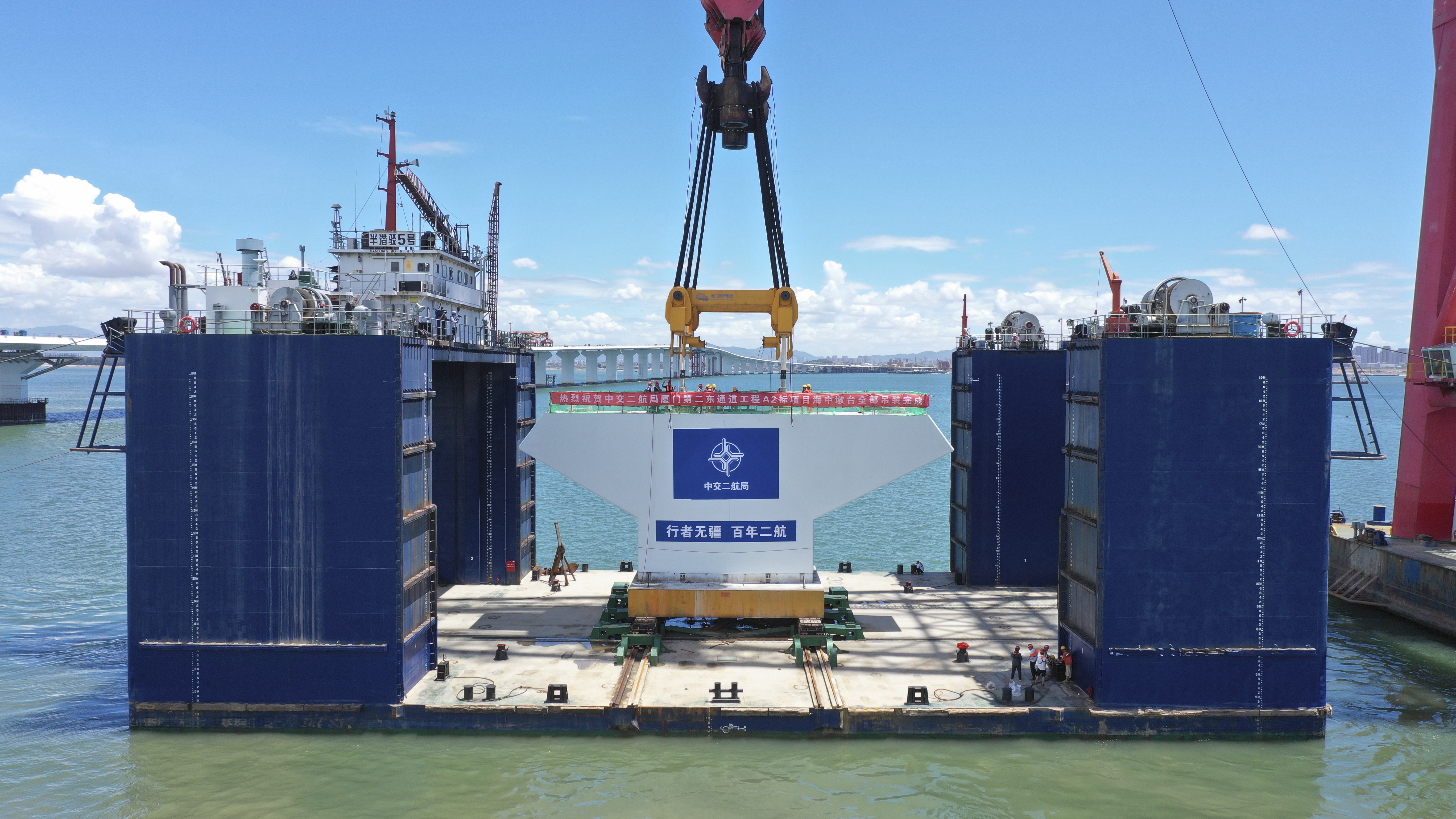 中交二航局厦门第二东通道A2标段负责人柴海峰介绍:“海中墩台吊装的全部完成,为国内复杂海域、航空限高条件下预制墩台的绿色智能建造提供了成功实践,后续项目团队将稳步推进墩台装配化成套技术研究。预计8月底将实现全桥合龙。”