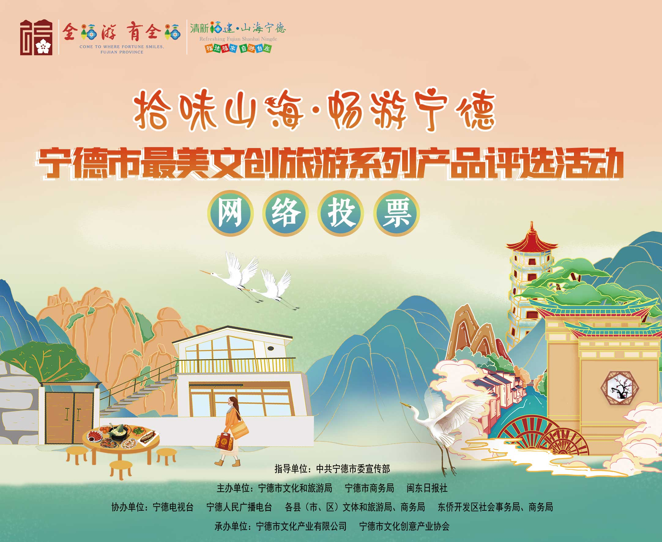 本次评选活动由中共宁德市委宣传部指导,宁德市文化和旅游局、宁德市商务局、闽东日报社主办,宁德电视台、宁德人民广播电台、各县(市、区)文体旅局、商务局,东侨开发区社会事务局、商务局协办,宁德市文化产业有限公司、宁德市文化创意产业协会承办。