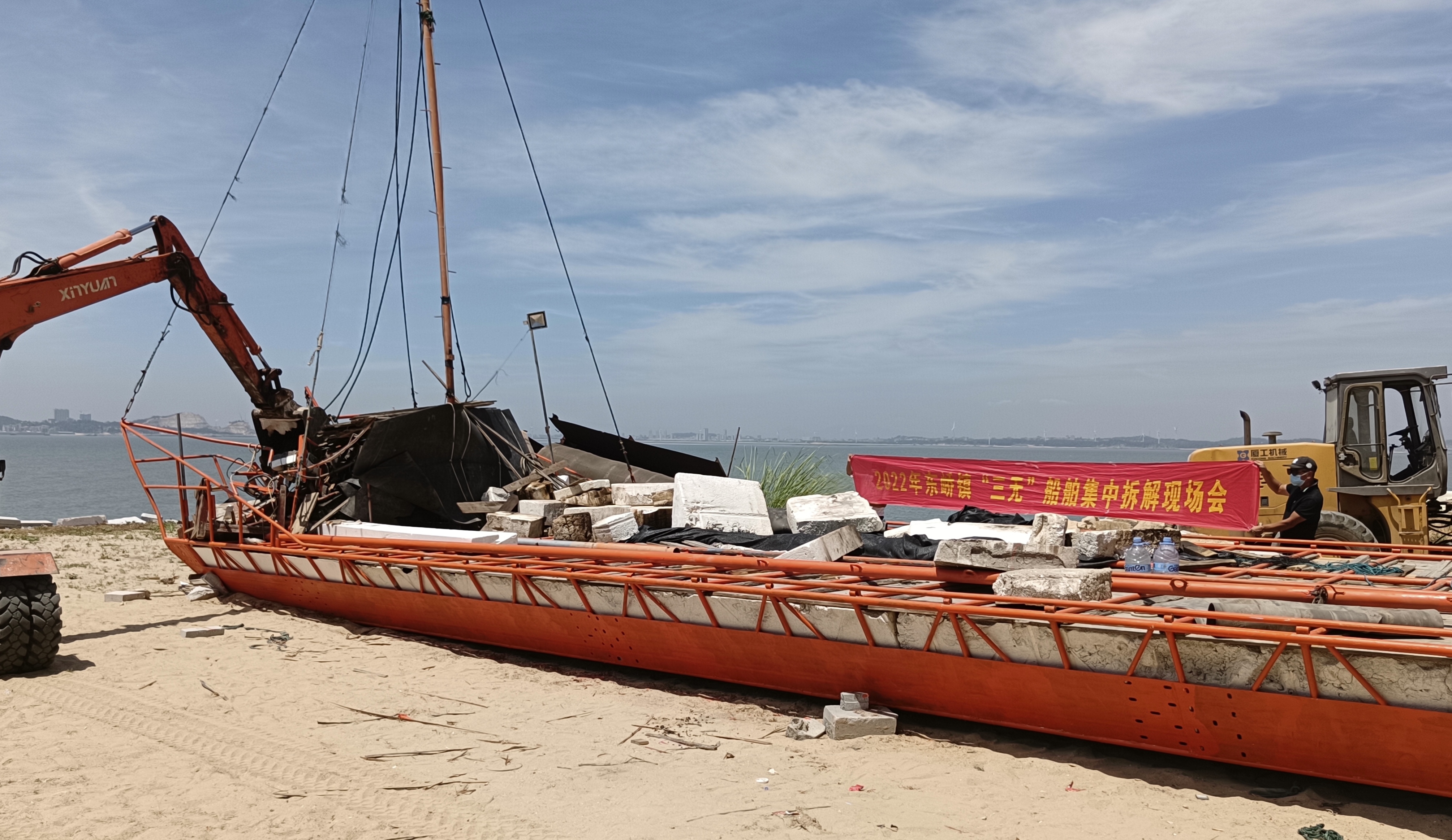 当天上午,在东峤镇政府、秀屿区海渔执法大队、海警秀屿工作站、秀屿公安海防大队、东峤派出所工作人员的监管、见证下,工人们利用挖掘机、切割机等工具,对这些“三无”船舶进行拆解。现场,随着大型挖掘机摇臂的阵阵撞击,一艘艘“三无”船舶被依次拆解。