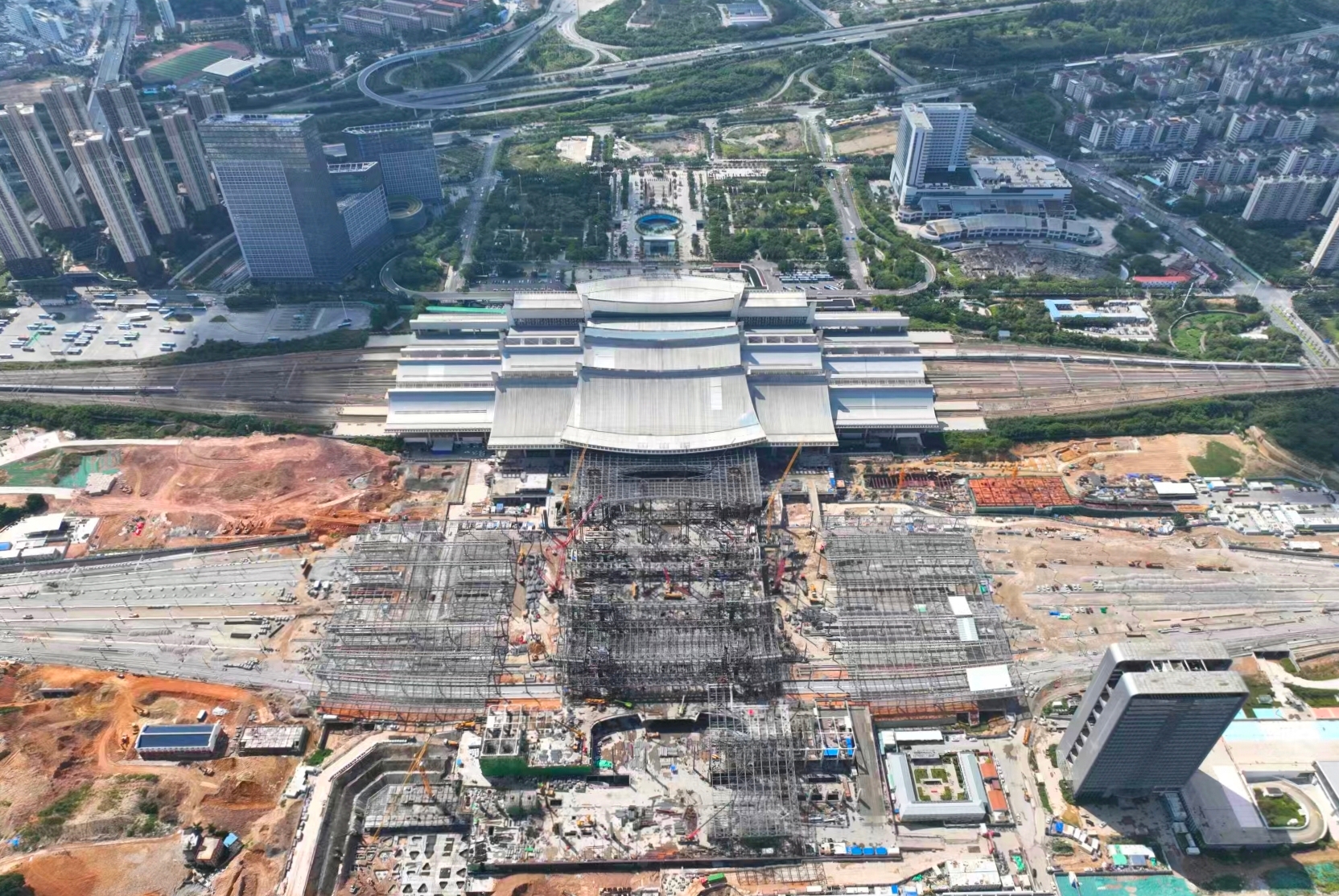 据介绍,新建厦门北站项目已于6月底全面完成站房混凝土主体结构施工,目前已经全面进入钢结构施工攻坚阶段。该项目钢结构总量约3.2万吨,主要分为站台高低雨棚、换乘中心钢屋盖、新建站房钢屋盖三部分施工。目前,站台低雨棚钢结构、换乘中心钢屋盖施工均已完成,正全力抢抓新建站房钢屋盖施工,预计九月底全面完成。