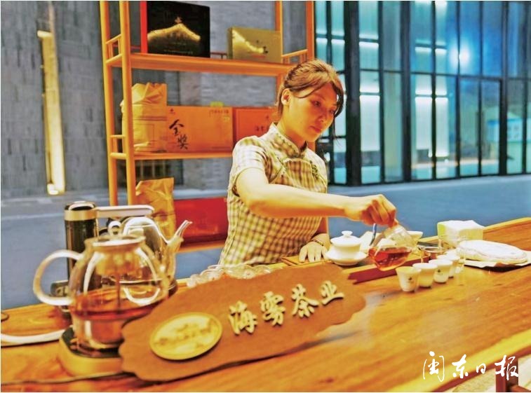 政府搭台,茶企唱戏,除了在旅游集散中心设置茶吧外,在周宁县尚城广场也有一个茶企的“舞台”。炒茶、闻香、品鉴、交流……在周宁最繁华的夜市街道,这一片“茶香区”分外热闹。