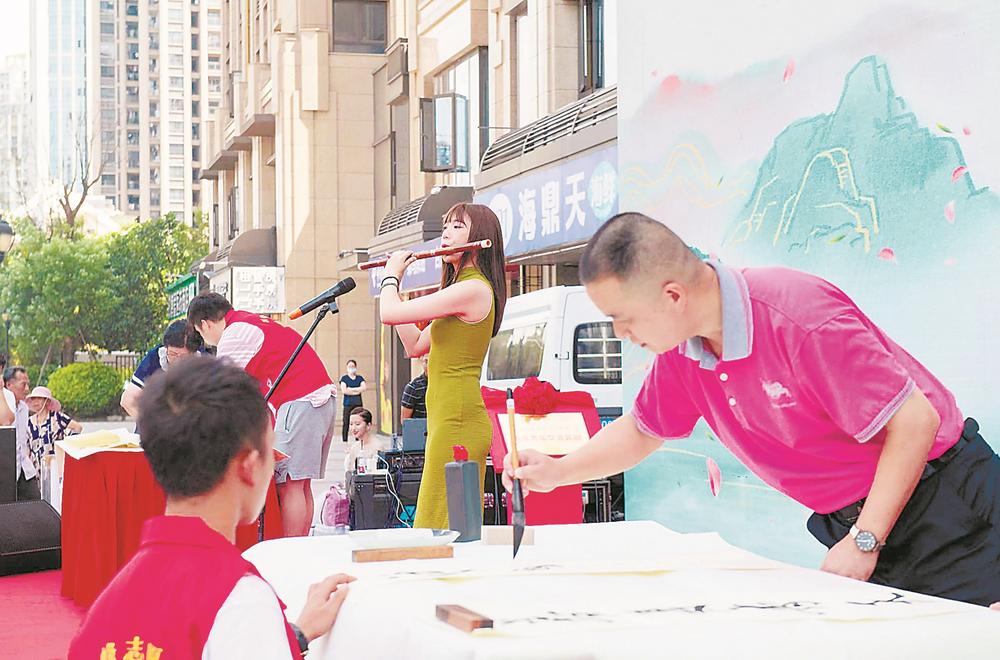 在开幕式上,台青竹笛演奏,书法家现场挥毫。
