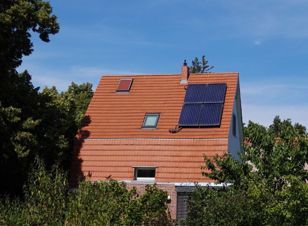 这是8月3日在德国柏林拍摄的一户人家房屋上的太阳能面板。(新华社记者任鹏飞摄)