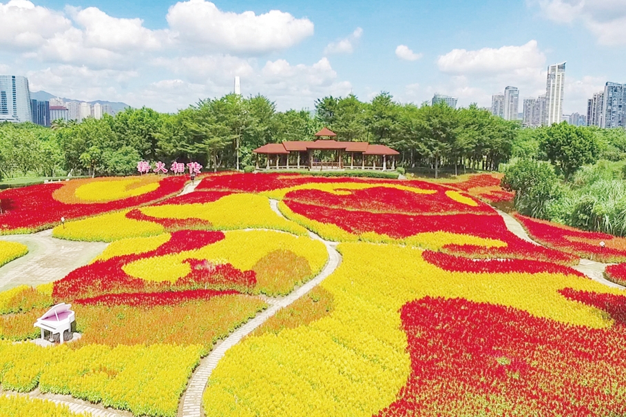 9月29日,厦门园林博览苑,大片凤尾花正在盛放。红、橙、黄三色凤尾鸡冠组成6000平方米火焰图形,“薪火相传”,喜迎国庆。国庆假期,园博苑为市民游客准备了丰富多彩的活动,包括花艺展、惠民演出、花展等。走,约起!