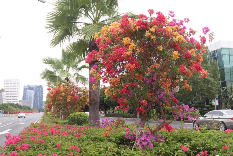 记者来到江滨东大道,放眼望去,三角梅开满了整条马路。道路中间尽是三角梅, 有一大片开得十分红艳的三角梅。它们站在路边迎风摇曳,远远望去,宛若一群热情的孩童。