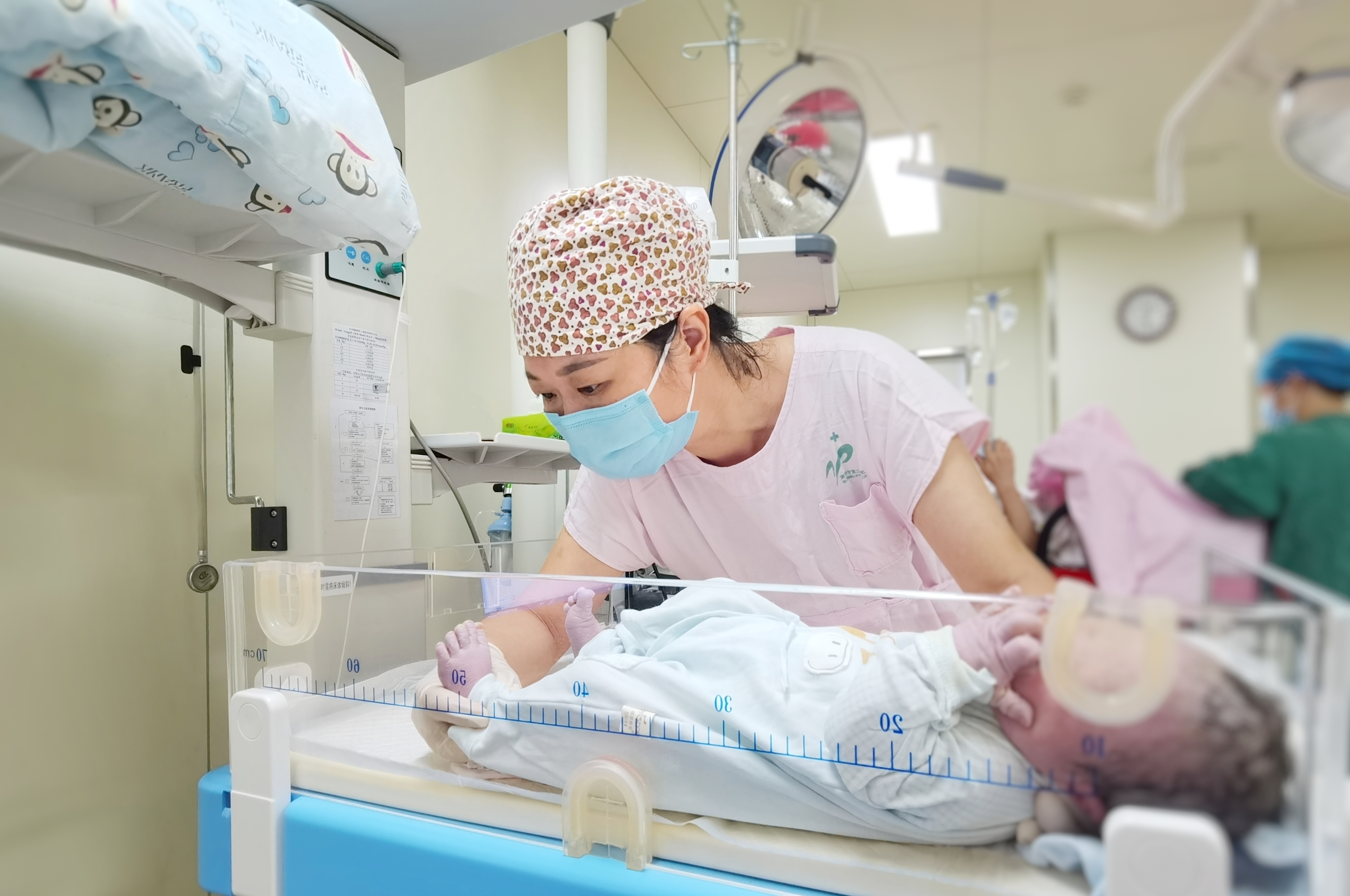 南平市第二医院助产士为刚出生的“国庆宝宝”测量身高。(南平市卫生健康委 供图)