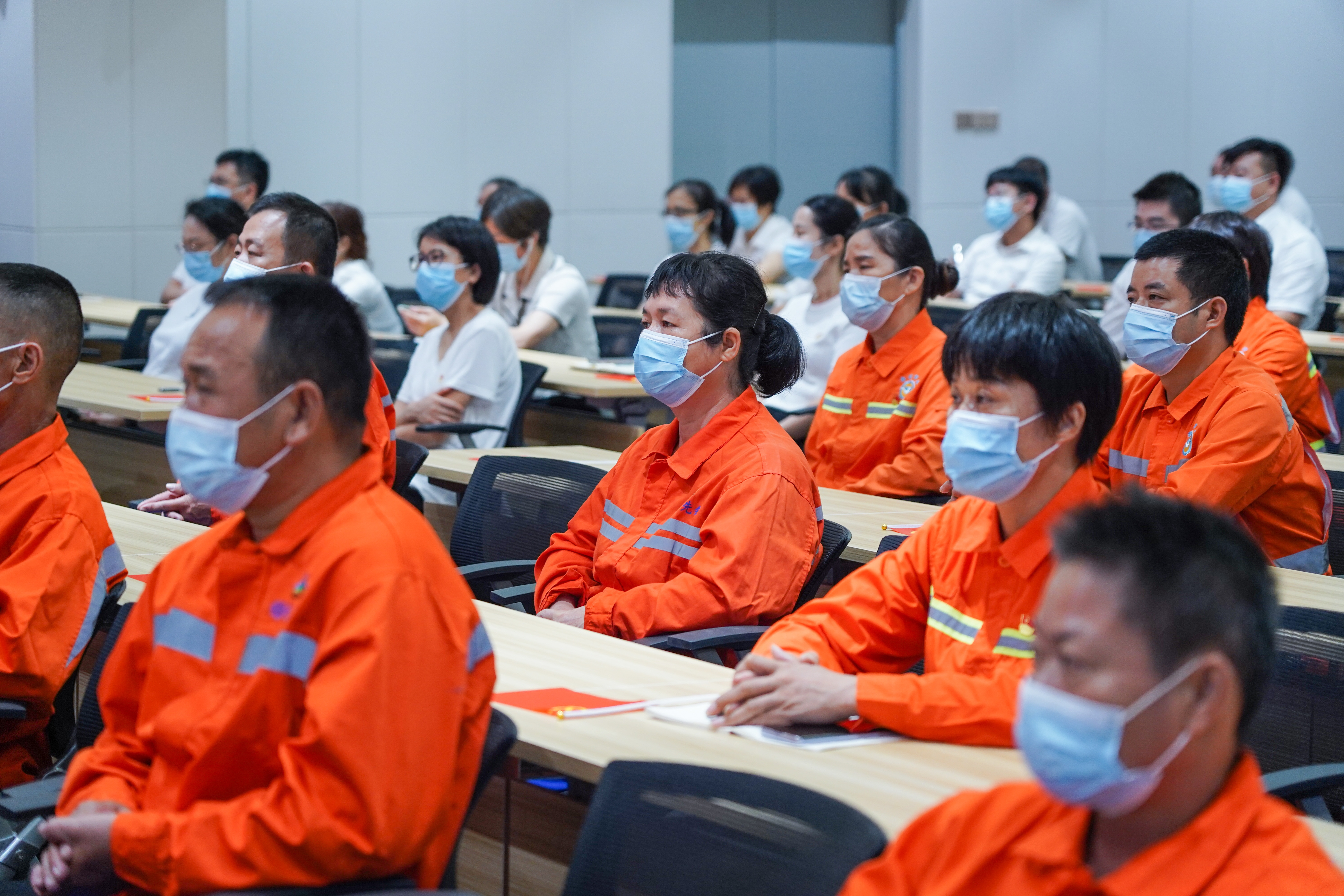 当天,包括环卫、绿化在内的海沧区城建集团广大干部职工,都在各自的岗位上组织收看二十大开幕式,认真聆听报告。记者看到,在海沧市政大厦二楼会议室,80多名党员职工以昂扬的精神状态注视着大屏幕,认真地看,认真地学,不时爆发热烈掌声。其中,20名来自一线的市政、园林职工特地身着工作服,用一抹橙色致敬党的二十大。