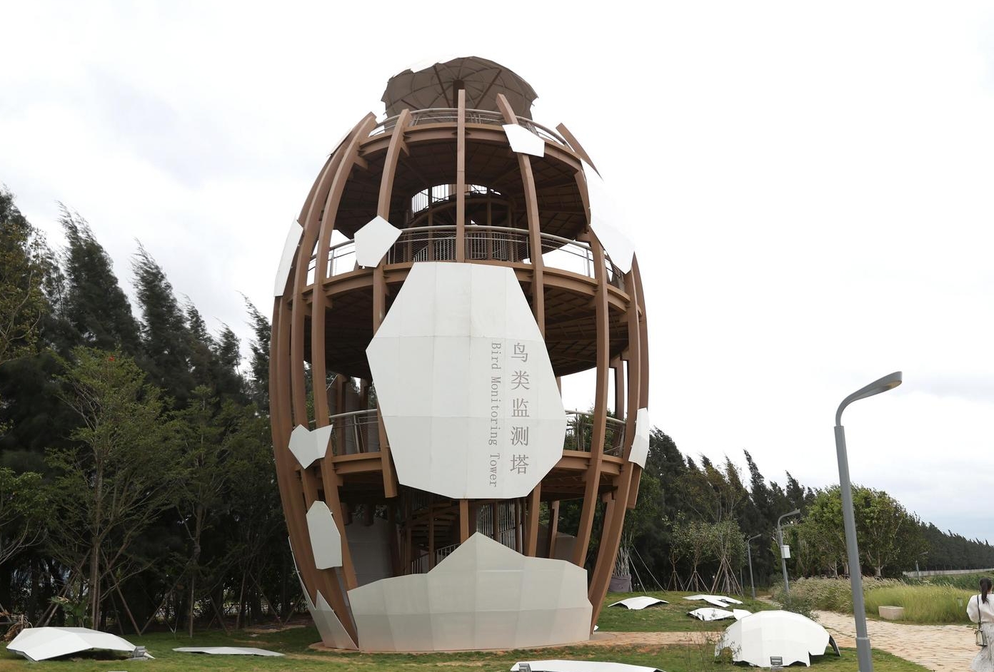 在晋江陈埭镇沿海大通道外侧,泉州湾河口湿地省级自然保护区实验区内,一颗“巨蛋”破壳而出。这是泉州市“蓝色海湾”综合整治项目二期工程的鸟类监测塔,近日刚刚完工。