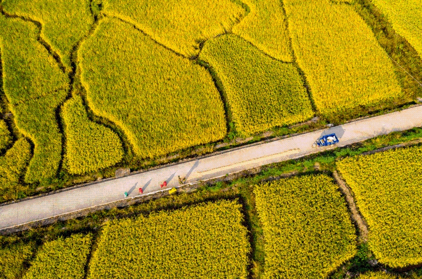 当十一月的风吹甜瓜果、缀满枝头,一不小心打翻大自然的调色盘,稻谷的金黄、柑橘的橙黄、柚子的青翠......缤纷的颜料肆意泼洒下来,随笔一挥描绘了一幅盛大而热烈的丰收画卷。