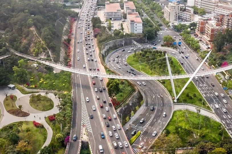 厦门山海健康步道和美桥连接仙岳山至狐尾山,中间跨过仙岳路、海沧大桥引桥,是独塔单侧悬挂曲线悬索桥,是目前世界上同类型桥梁结构中跨径最大的桥梁,桥面宽度3.8米,钢箱总宽4.4米,塔高50米。