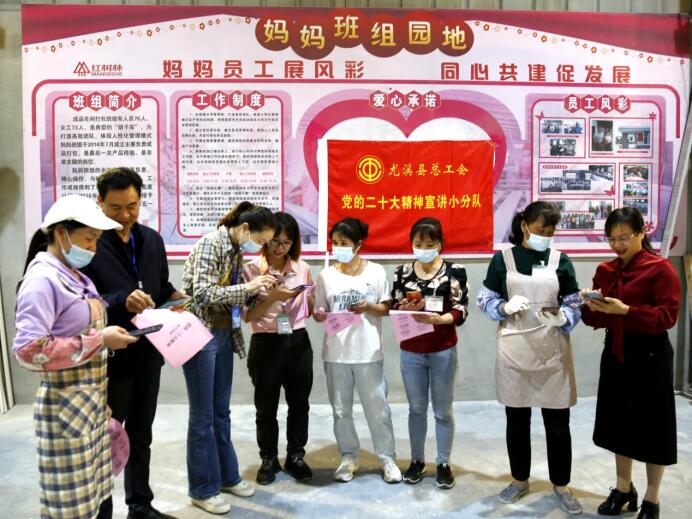 在红树林木业公司,三明工匠詹桂城与县总工会宣讲成员来到企业车间妈妈班组,通过党的二十大知识快问快答等形式,与大家进行互动交流,进一步提升了职工们的学习积极性。“接下来,我们计划组织大家开展一场学习分享会,引导广大职工以党的二十大精神为指导,紧密结合企业发展和自身工作实际,在各自岗位创造不凡业绩。”红树林木业公司行政部经理朱兴榕说。