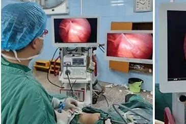 外一科杨盛洲主任介绍:“小儿腹股沟疝是一种先天性疾病,新生儿期即可发病,如不及时治疗,容易出现嵌顿疝,导致嵌顿器官坏死,引发严重后果;有的疝会带着肠管进入阴囊,导致睾丸缺血、坏死,引起生育功能严重影响”。相对传统腹股沟区开放手术而言,疝囊高位结扎术是治疗小儿腹股沟疝的主要手术方式,其中又以腹腔镜下疝囊高位结扎术更加微创可靠,一般是通过脐部穿刺一个约5mm的探查孔,找到疝囊位置,使用疝钩针穿刺入腹膜外,完全于腹膜外完成疝囊高位结扎术。