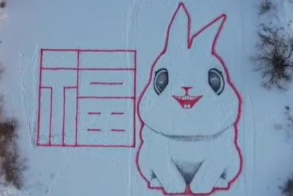 被萌到了!大叔雪地里创作巨幅玉兔接福画
