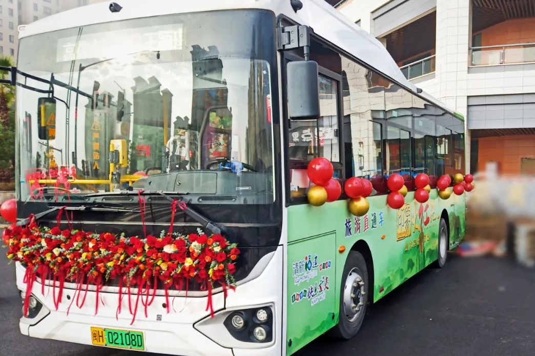当天一早,建阳公交的驾驶员杨旭早早整装待发,迎接新人。这辆新能源公交车的车头装饰红色玫瑰花,车身挂满彩色气球,车窗贴着囍字,车厢内挂满喜庆挂件。