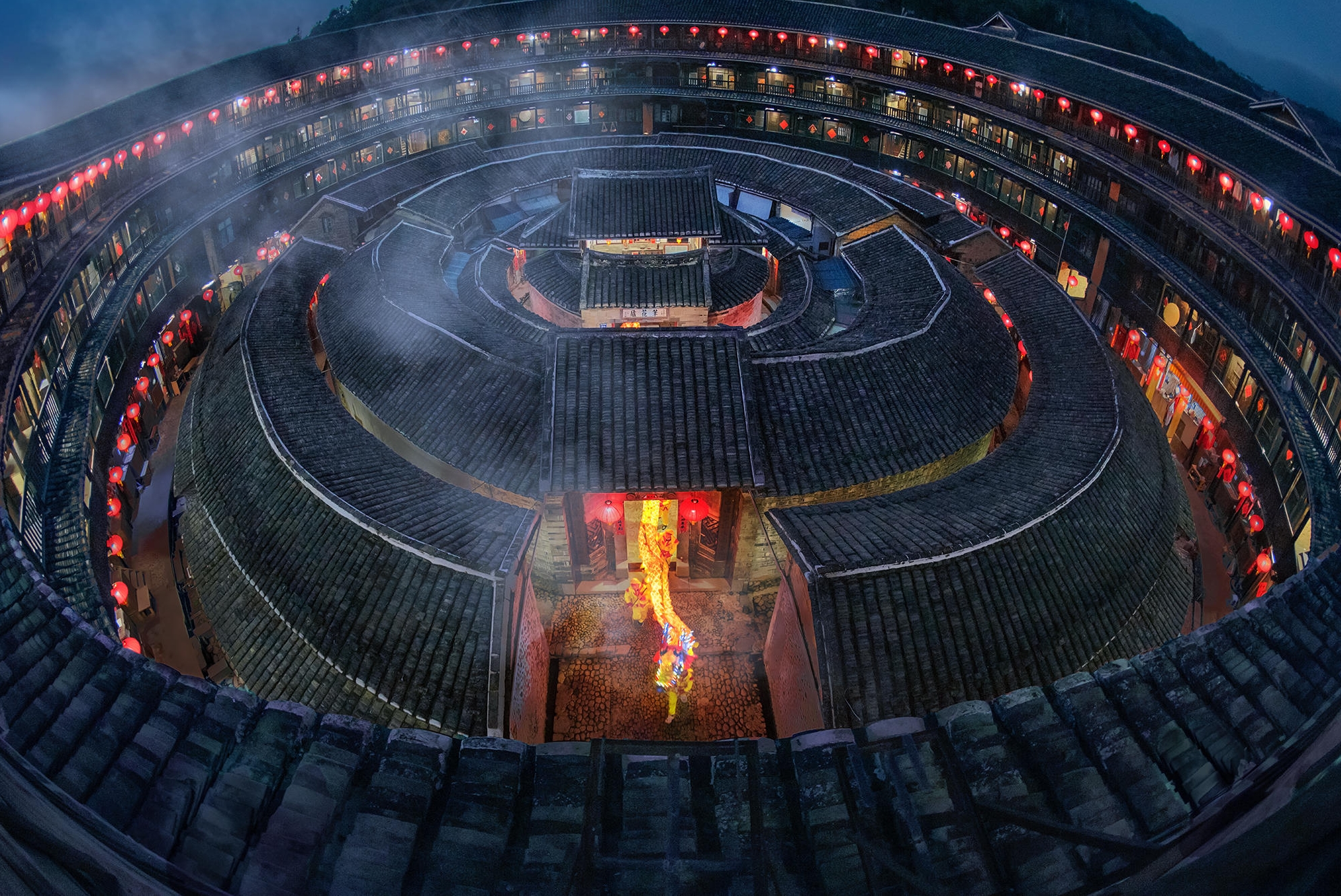 土楼人家在楼内张灯结彩,节日的脚步走近,鞭炮齐鸣、热闹非凡。大家兴高采烈地庆贺新年,祈愿新年幸福和谐、国泰民安。张炜/摄