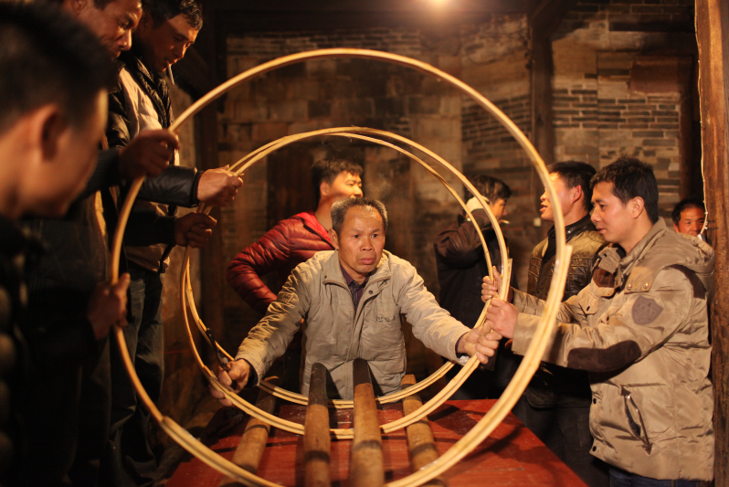 别看他年纪大了,做起旱龙船还是老当益壮,带着年轻的匠人们选竹、拉丝、塑身、拼接……,制作工艺艰巨、浩大,且必须在一昼夜的时间赶制完成,靠的是大家团结协作。轧制成形的旱龙船全长约6-8米,高约3-4米,看起来很壮观,在整个闽北乃至全省全国都属罕见。