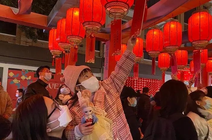 2月4日晚,记者在现场看到一路张灯结彩,红灯笼高挂,满满的喜庆氛围。在解放大桥街区入口处的猜灯谜区域,众多灯谜悬挂在大红灯笼下,吸引市民热情参与,认真答题。